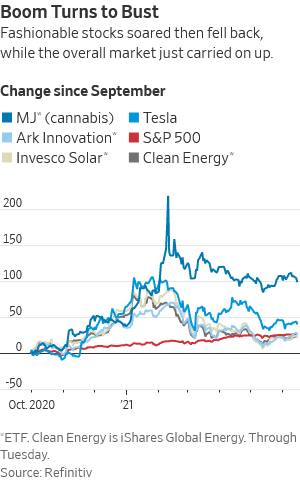 But the plunge of share prices in clean energy, electric cars, and cannabis, and even the halving of bitcoin, puts much less of a dent in the wallets of consumers than the dot-com bust did because the bubble is less widespread. Nasdaq’s bubble gave it a value of about half that of the S&P at its 2000 peak, while even with Tesla, the frothy sectors of the past nine months are a fraction of that.