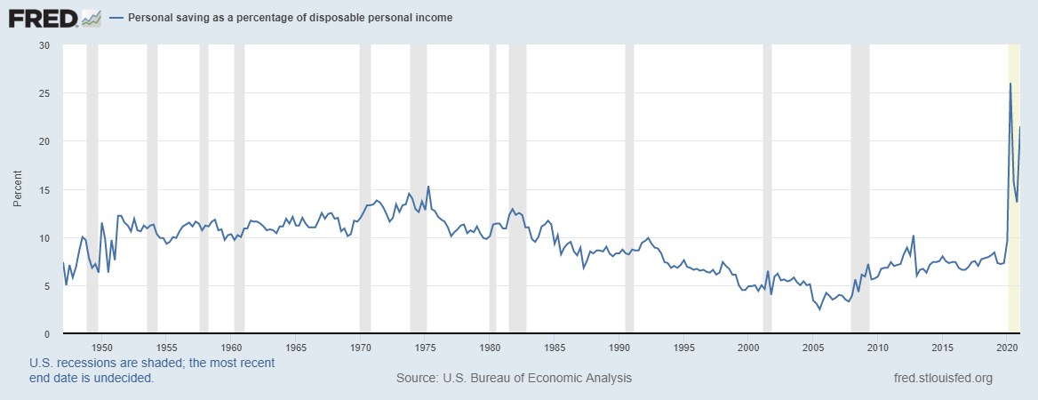 A quick check of Fed data (6/30/2021) shows an enormous spike in personal savings as a percentage of our income.