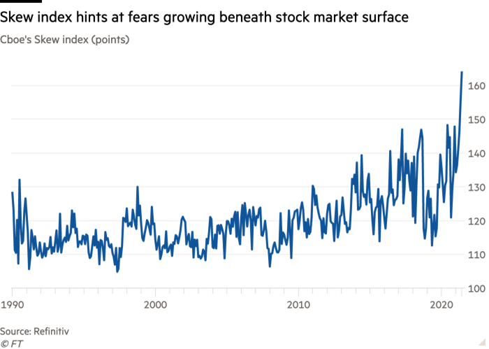 The Skew Index is compiled by the big Chicago-based options exchange Cboe and is constructed to typically range between 100 to 150 points, where a value of 100 signals that stock market movements are expected to be roughly normal, and higher readings indicate that investors are paying up to hedge themselves against crashes. The index has mostly drifted upwards over the past decade but has climbed particularly sharply over the past month as the rising demand for protection has swamped the fading willingness of other investors to sell it. That lifted the index to a record 170.5 points last week, according to Refinitiv data. (Robin Wigglesworth in Oslo and Michael Mackenzie, “Record Skew index shows nagging investor nerves on US stocks rally,” FT.com, 7/1/2021)