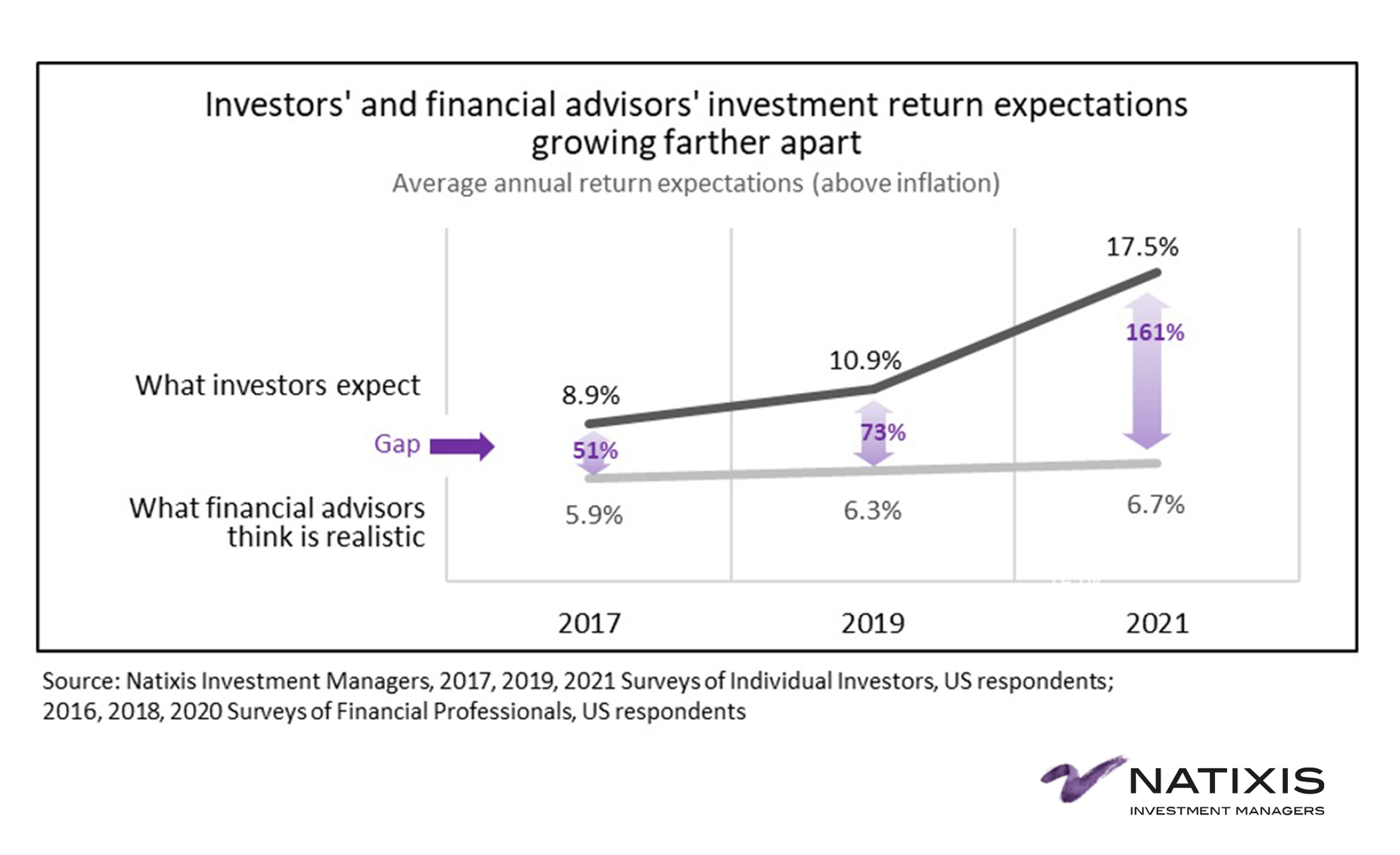 Against the backdrop of last year’s frenzy, a 2021 Natixis survey of relatively sophisticated investors shows that American investors now expect 17.5% annualized real returns on stock investments.