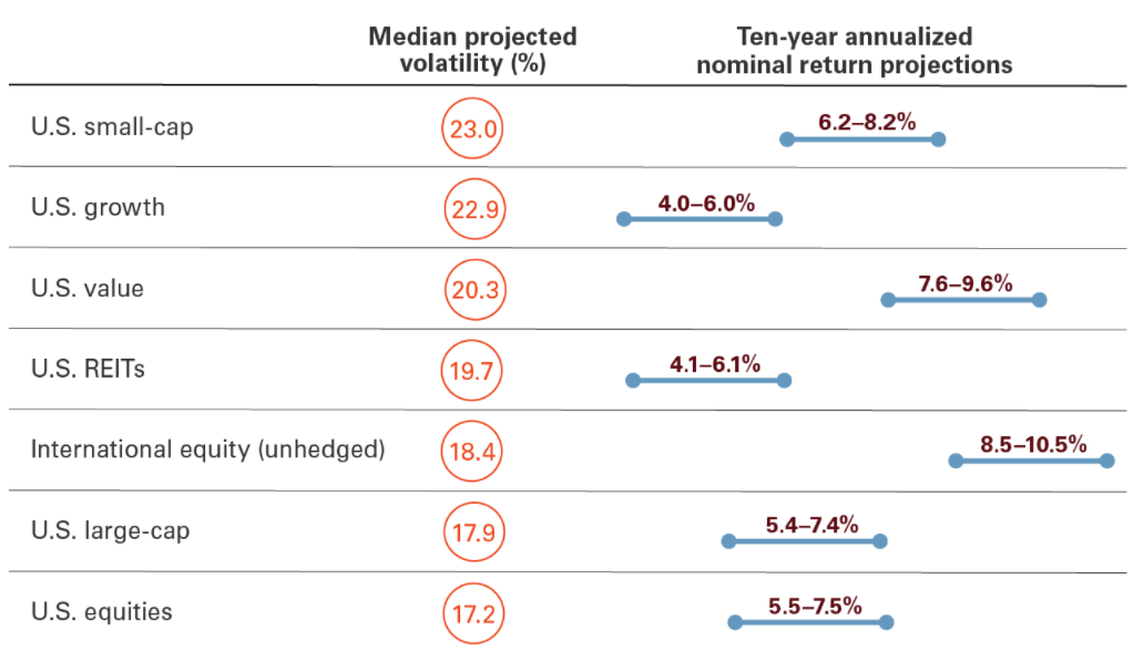 Vanguard’s projected returns over the next decade as discussed in Beyond the Pandemic: What to Expect from Stocks, Bonds (June 2021) are more generous than most that I have seen.