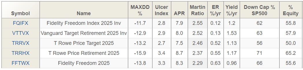Next, I look at the five different fund groups that I track using the 2025 Category with metrics shown for the past five years. First, allocations to equities range from 50 to 65 percent with T. Rowe Price Retirement 202 (TRRHX) being the one outlier. The allocations to foreign stocks generally fall between 35 and 41 percent of the total allocation to stocks with Fidelity Freedom 2025 being an outlier with foreign stocks making up 53 percent of the total allocation to stocks. The funds are sorted from highest risk adjusted return (Martin Ratio) to the lowest. In other words, over the past seven years the active management of some funds did not overcome the low-cost advantage of index funds. True, TRRHX and FFTWX had slightly higher average annual returns, but also slightly higher drawdowns.