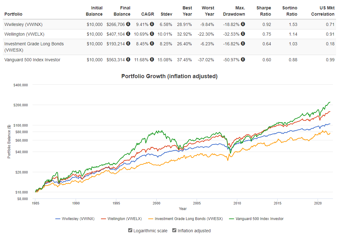 In retrospect, during the past 36 years, the Vanguard Wellington, a balanced growth fund, returned 10.7%, almost as much as the 11.7% of the S&P 500, while the conservative Vanguard Wellesley returned a respectable 9.4%. During this period, the markets experienced the Black Monday stock market crash of 1987, the bursting of the Technology Bubble and Housing Bubble/Financial Crisis, and the COVID-induced recession. Part of the success of the mixed asset funds was due to rising bond prices as interest rates declined.