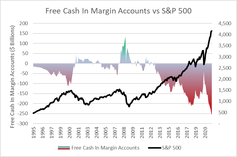 Low interest rates have made it cheaper to buy stock on margin. The increase in margin is another driver of stock market increases over the past decade as shown by the negative free cash in margin accounts. Conversely, a declining market encourages the quick exodus from margin as can be observed prior to the 2020 bear market.