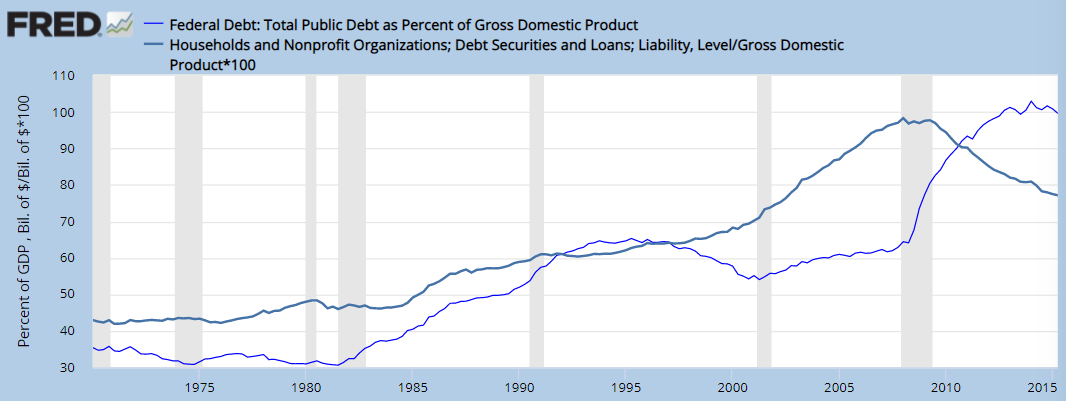 Federal debt and deficits have been climbing to the extent that Federal Debt to GDP is near the levels following World War II. High debt levels reduce the amount of capital available for investing in future growth. Technology and lower taxes combined have not grown the economy enough to create a balanced budget. This is not sustainable, so spending has to be cut or taxes raised.