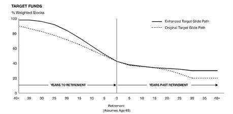 The glidepath stipulates only the very broadest allocation decisions: stocks versus bonds. One Investment Committee has the responsibility for strategic allocations (domestic vs. international, small versus large, value versus growth) within those broad bands and for choosing the funds (e.g., New Horizon, Small Cap Index or Small Cap Value) which offers the most attractive risk-return profile for implementing the team’s judgments. Another, the Asset Allocation Committee, makes the shorter-term tactical decisions about overweighting asset classes or sectors.