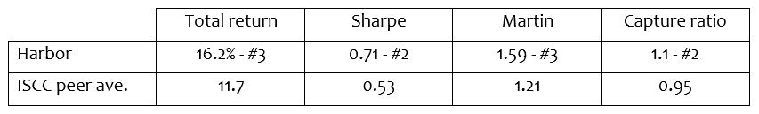 Total return is a fund’s average annual return for the period; Harbor had the highest total return. Sharpe and Martin ratios are standard and conservative measures of risk-adjusted performance; Harbor was again first. And capture ratio is a sort of “how much bang for the buck” calculation; any score above 1.0 means that you’re winning. Relative to a standard international all-cap index, Harbor does a better job of capturing more of the index’s upside than downside than any of its peers.