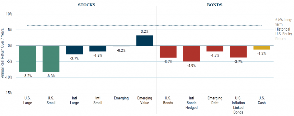 It might be worth looking at Japanese small value stocks. GMO, famously insistent that valuations matter and trees don’t grow to the sky, now project negative real returns on virtually every asset class over the next 5-7 years. Their model is based on the simple assumption that profit margins and stock valuations must, eventually, return to something like “normal.” If they do, the wild prices for all assets – and the hefty 11% annual returns that investors in an utterly vanilla 60/40 index fund have pocketed over the past decade – foretell A Great Reckoning.