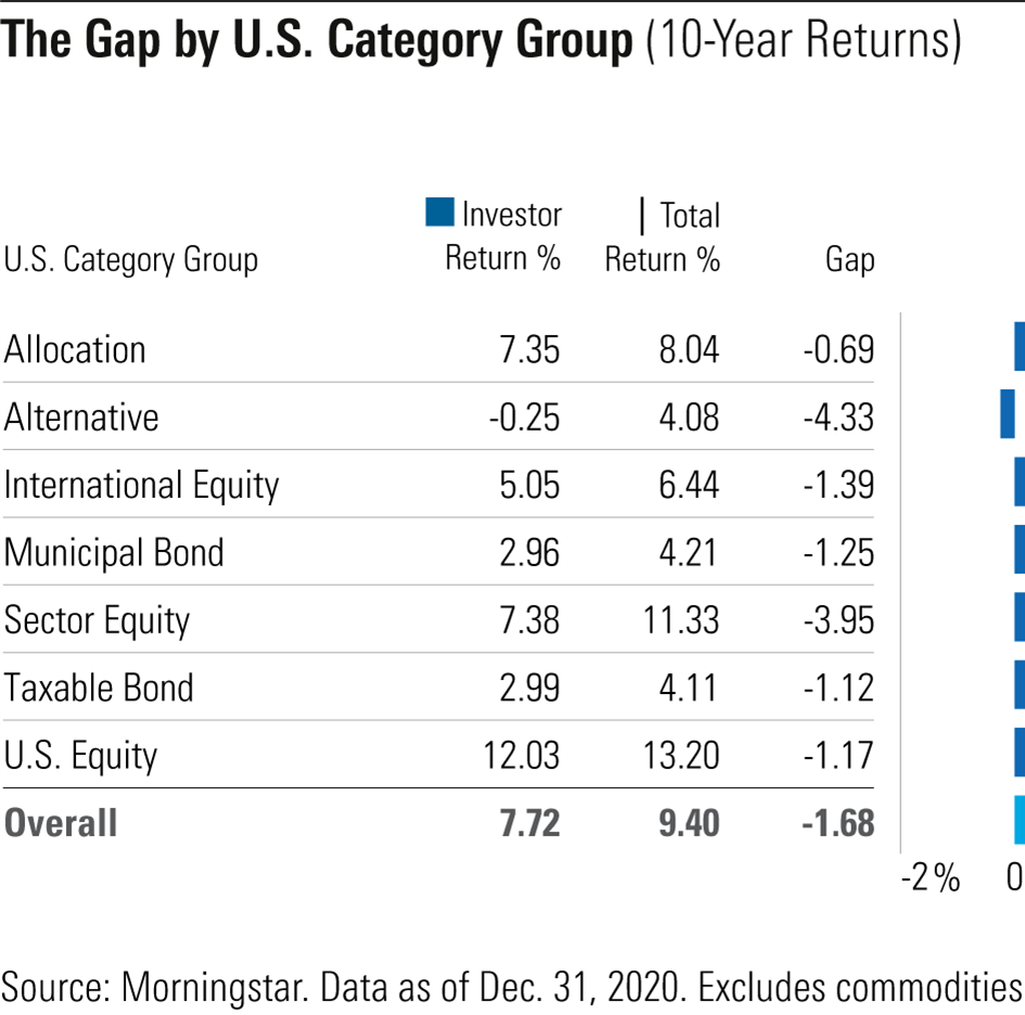 Our annual “Mind the Gap” study of dollar-weighted returns (also known as investor returns) finds investors earned about 7.7% per year on the average dollar they invested in mutual funds and exchange-traded funds over the 10 years ended Dec. 31, 2020. This was about 1.7 percentage points less than the total returns their fund investments generated over that span. (Why Fund Returns Are Lower Than You Might Think, 8/30/2021)