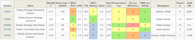 As an overview, Table #1 contains some of my favorite metrics and ratings from Mutual Fund Observer for a select few funds managed by Mr. Kramer and Mr. O’Neil. The funds are Conservative (MFO Risk = 2) to Aggressive (MFO Risk = 4) and the Lipper Preservation Ratings are Average (3) to Above Average (4). The MFO Rating shows that the funds have Average (3) to Best (5) risk-adjusted performance for their categories. The Ferguson Mega Rating has the funds from Average (3) to Best (5). The Fidelity Advisor Strategic Income (FSIAX/FADMX) and the Fidelity Convertible Securities (FCVSX) have an average Lipper Rating for Five Year Tax Efficiency and the rest are less tax efficient.
