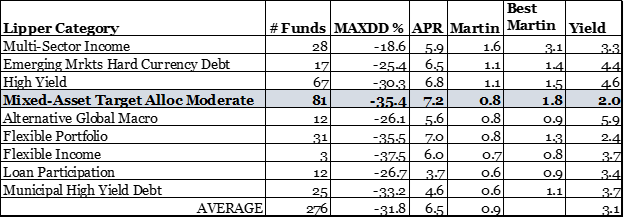Table #2 shows the average performance over the past fifteen years of all of the funds with the exception of those rated in the lowest fund family in these Lipper Categories. Martin Ratio is the risk adjusted performance and “Best Martin” is the highest Martin Ratio for all funds within that Lipper Category. Over the past fifteen years, the Multi-Sector Income Category had the highest risk adjusted returns. The traditional Moderate Allocation Mixed Asset Fund category has done well.