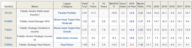 The Fidelity Asset Manager 50% (FASMX) is shown as a baseline fund. All funds have compared well against their peers for the past five years. Fidelity Advisor Multi-Asset Manager (FAYZX/FMSDX) has performed better than FASMX with a lower drawdown and higher yield. Fidelity Strategic Dividend and Income (FSDIX) has also outperformed FASMX, but with a higher drawdown and higher yield. Over the past fifteen years. Fidelity Advisor Strategic Income (FSIAX/FADMX) has performed relatively well compared to FASMX but with a higher yield. FSRRX has not performed well over the past fifteen years, because inflation has been low, but the yield is decent.