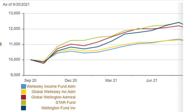 I selected the Global Wellington and STAR Funds for the more aggressive side of the portfolio partly because they are more global, and the Wellesley Fund as the more conservative, domestic side of the portfolio. The Global Wellesley Fund is more of an unknown to me, and I selected it as a conservative global fund, but have a lower allocation to it.