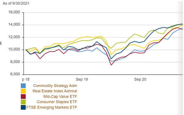 I allocate 15% to a tactical sleeve based upon funds that do well in the coming stages of the business cycle, as well as momentum and valuations. In the tactical sleeve, I own the Vanguard Commodity Strategy Fund (VCMDX) which has exhibited lower risk than most commodity funds. I also recently bought the Vanguard Consumer Staples ETF (VDC). The tactical sleeve often consists of higher risk funds (MFO Risk = 4). The portfolio is moderate (MFO Risk = 3). The maximum drawdown of this portfolio would have been around 11 percent during the 2020 bear market, and the return would have been around 12 percent.