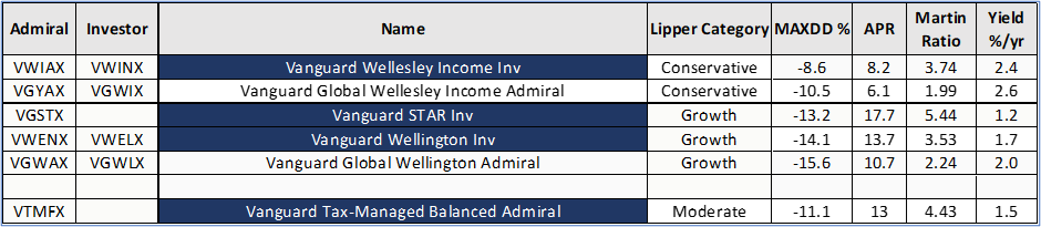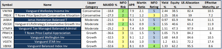 What the table points out is that the funds are conservative (MFO Risk =2) to moderate (MFO Risk =3) while the Lipper Category classifies them as conservative, moderate, and growth. The names in blue indicate the funds that have the MFO Great Owl Classification for high-risk adjusted performance. Martin Ratio is the risk-adjusted performance. I added the column for percent equity as another measure of risk (and returns), and percent domestic allocation to show that while many of these funds have done well, they have invested largely in the US which now has much higher valuations than many other markets. Vanguard Wellesley Income (VWIAX) is a great conservative fund that invests mostly domestically.