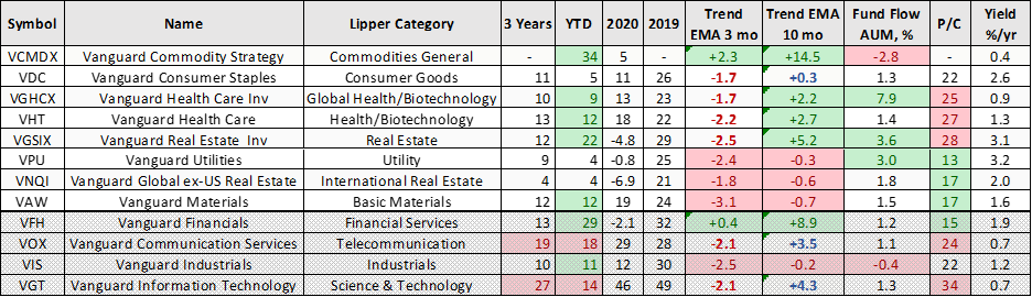 Table # 3 shows most of the Vanguard Sector Funds. Those in the top two sections (eight funds) typically do well in the late stage of the business cycle. Those in the top section (five funds) are trending higher and may be more favorable for the next year or two. Those in the bottom section are what I want to underweight as they do well in the Recovery stage, but may now be more over-valued. The Vanguard Commodity Strategy Fund has had strong trends but has seen some withdrawals recently. I am holding, but watching as I read some consumer staples such as food and natural gas for home heating continue the trend of higher prices.