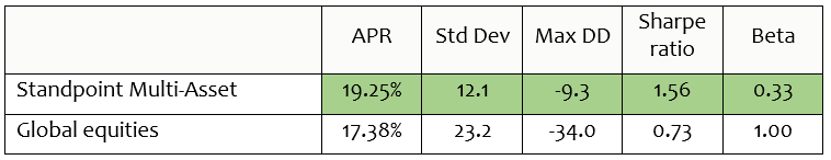 The performance of the strategy, since inception, against a global equity portfolio, is pretty striking. The same color scheme applies.