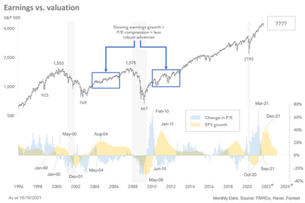 Earnings growth seems to have peaked for this cycle, and forward valuations are coming down as well. This is a typical transition in the cycle, which suggests that the rapid ascent of stock prices slows from here…