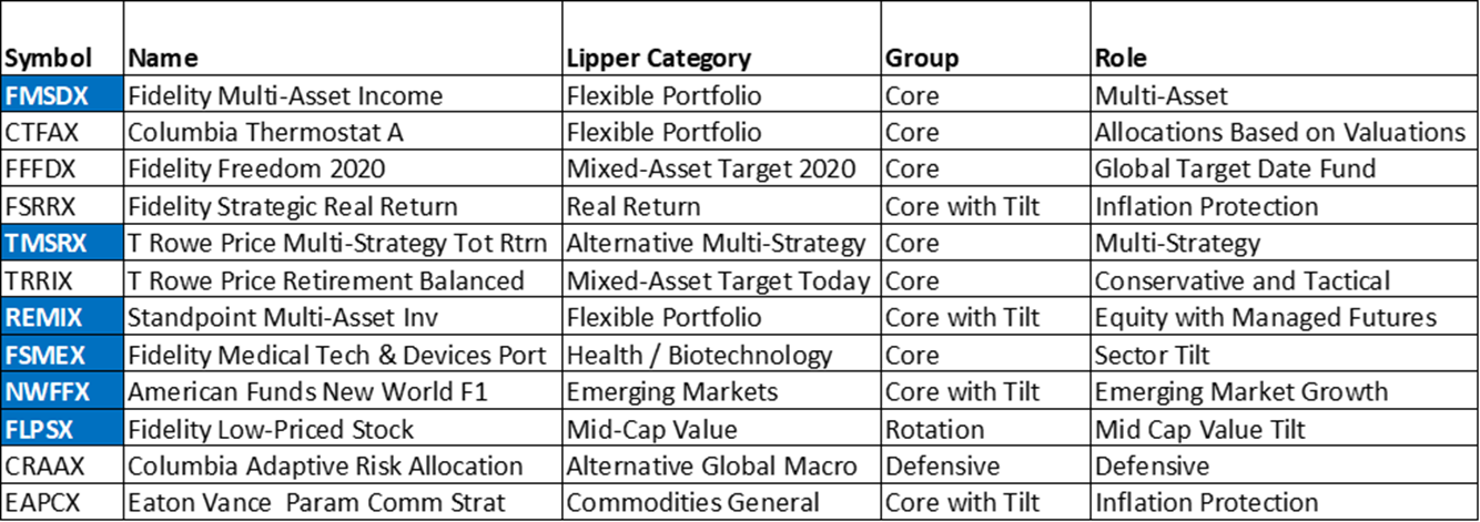 Table #3 contains the funds in my Fidelity Traditional IRA. The majority of the funds are “buy and hold” (Core), with five funds that I may rotate over time. Standpoint Multi-Asset Fund (REMIX) is less than two years old, so I will monitor it. The symbols shaded blue have the MFO Great Owl classification. All funds are rated four star or higher by Morningstar except REMIX (Not Rated), CRAAX (3 Stars), and FSRRX (2 Stars).