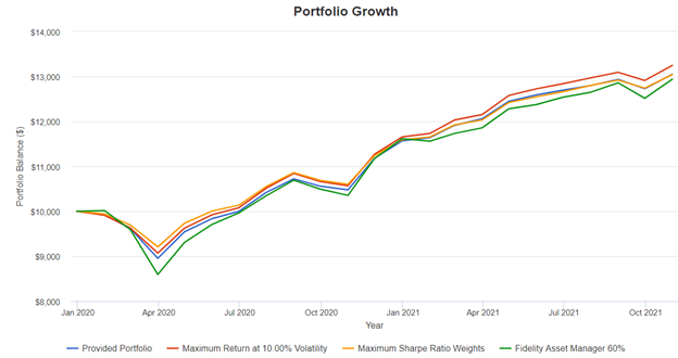 | Symbol | Name | Alloca-tion | Maximum Return at 10% Volatility | Maximum Sharpe Ratio Weights | Fidelity Asset Manager 60% |