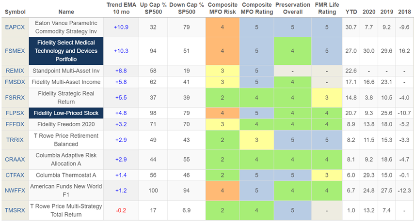 For the middle stage of the business cycle, I am interested in funds that have higher risk-adjusted returns with some momentum. Trend EMA 10 Month shows how the funds are performing relative to their 10-month exponential moving average. They are sorted from highest to lowest. We are now in an inflationary environment and some funds will perform differently as measured by the Percent of the S&P 500 captured. The funds are rated Conservative (MFO = 2) to Moderately Aggressive (MFO Risk = 4). A final check is how the fund has done over the past several years to determine if there is still room to grow. Fidelity Select Medical Technology and Devices (FSMEX) has risen substantially over the past three years which is of concern. T. Rowe Price Multi-Strategy Total Return Fund has low returns year to date, but I hold it for the downside protection.