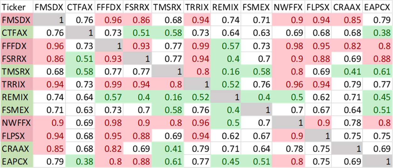 To be diversified, an investor needs to own, not just more funds, but funds that are not correlated. Table #5 shows that FMSDX, FFFDX, FSRRX, TRRIX, NWFFX and FLPSX are more correlated to one another while CTFAX, TMSRX, REMIX, FSMEX, CRAAX, and EAPCX are less so.