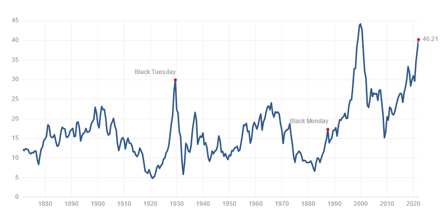 The US stock market is approaching the most extreme valuation levels of the past 150 years, at least as measured by the Schiller 10 year PE ratio.
