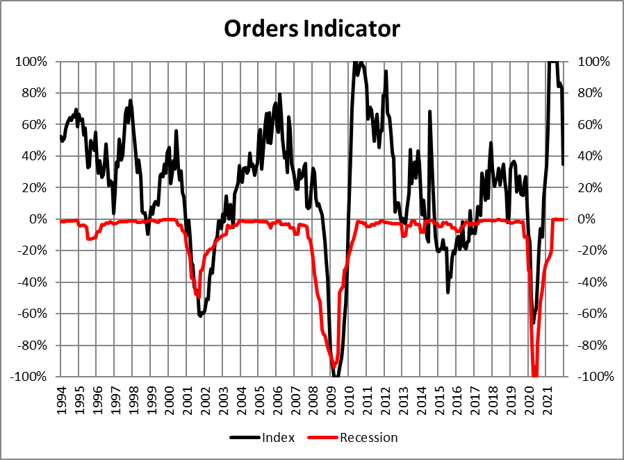 One of the reasons that I developed the Investment Model was to view the data myself because many of the relationships between indicators and markets are exaggerated by the Talking Heads. Below I show my Orders Indicator, which is a composite of durable goods orders (DGORDER, ADXDNO) and non-defensive capital goods orders (NEWORDER, ANDENO). Orders precede purchases and are a leading indicator of the economy. Orders show the economy is growing but at a slower pace. They are currently suggesting a major slowing of the economy.