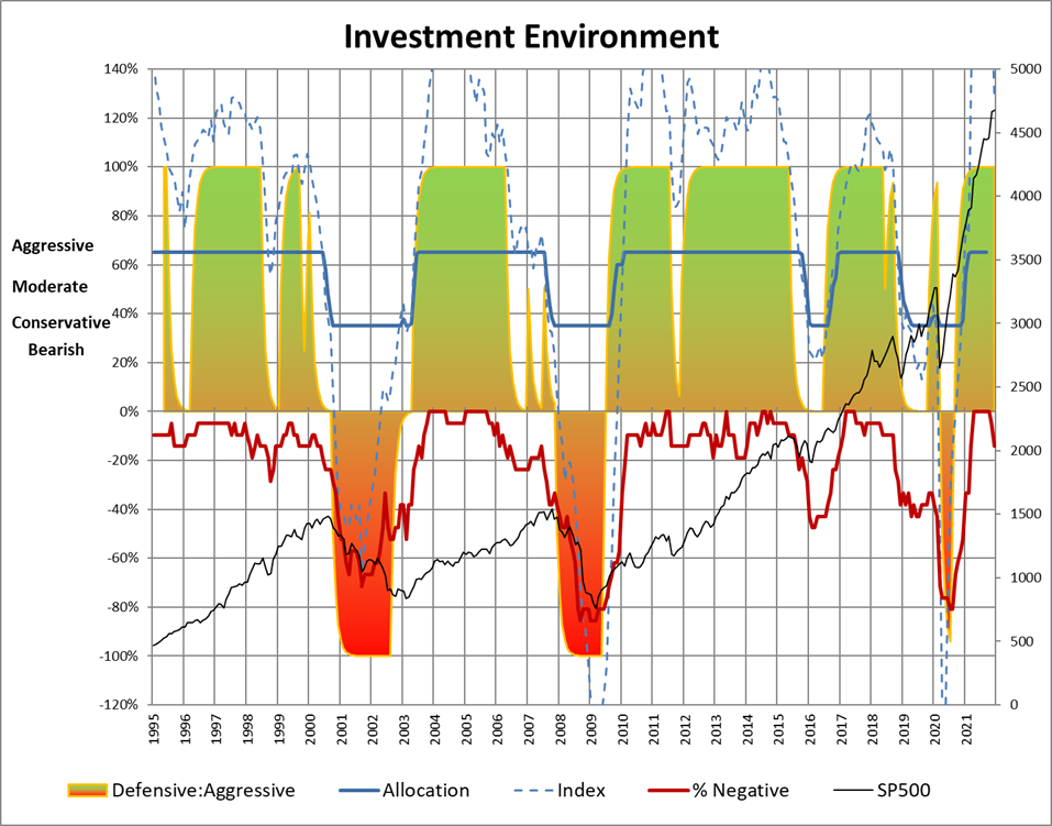 In Figure #2, the dashed blue line is the Investment Environment (IE) which is the basis of the Allocation Index before a 35% and 65% cap is applied. The Allocation Index (blue) is now at 65% stocks, recommending being at the more aggressive end of my allocation range. The red line is the percent of negative indicators and shows the breadth of the slowdown. It is clear that the IE index is falling rapidly, indicating a deterioration of the investment environment. For this reason, I believe that it is prudent to continue (gradually) to reduce risk in portfolios as we near the late stage of the business cycle.