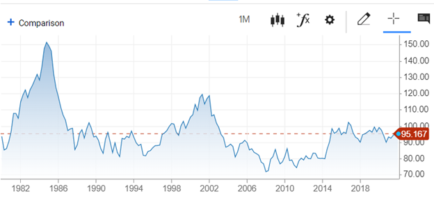 One factor that I include in my storyline is the high price of the dollar relative to other currencies, as well as high domestic valuations relative to international markets. As the Dollar Currency Index from CNBC shows, the dollar is at some of the highest levels in the past forty years. The 1980s saw the breaking of inflation, and the late 1990s experienced the technology bubble. I expect the dollar to weaken at some point in the next few years. High debt and deficits are another concern. International funds tend to outperform when the dollar weakens.