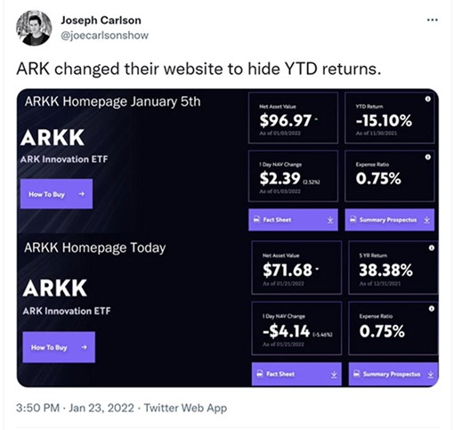 CityWire picked up on a tweet by Joseph Carlson, proprietor of the Joe Carlson Show on YouTube, which has 40,000 subscribers. I don’t know Mr. Carlson, but apparently, he argues for investing in high-quality, dividend-paying stocks, which seems entirely sensible. In any case, he spotted a quiet change on the ARKK Innovation homepage. Alex Steger, writing for CityWire, reports: