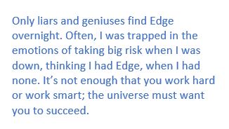 Did Edge always bring results? Far from it. Despite having the correct positions, the market is notorious for penalizing traders and testing convictions. There were nights I went home and went straight to sleep. The losses were gut-wrenching. Does having Edge mean I became George Soros or Warren Buffett? No, because there is a certain talent, drive, and ambition, maybe intelligence required, maybe luck and wisdom, that I did not have. Having Edge only means you can do one or a few things well and about as well as the universe allows you to do. But you must knock hard on the Universe’s door and ask for the chance.