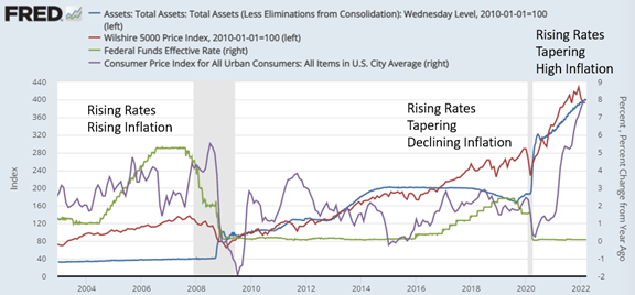 Figure #1: Inflation vs Fed Funds Rate and Federal Reserve Assets (QE)