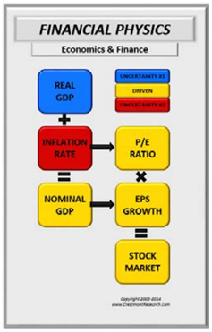 Ed Easterling, the founder of Crestmont Research, distinguishes between markets and the economy in what he calls Financial Physics. Mr. Easterling wrote Probable Outcomes and Unexpected Returns: Understanding Secular Stock Market Cycles, both great books that describe secular bull and bear markets and the role of inflation. Figure #2 shows the Financial Physics concept which he explains as:
