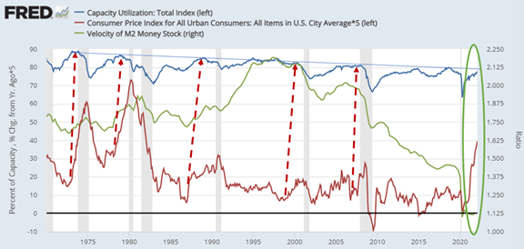 Commodity prices tend to rise as production approaches capacity as shown in Figure #3. The velocity of money is also shown and is basically the rate at which money changes hands. In spite of massive stimulus, the velocity of money has continued to slow until after the 2020 recession and since then has flattened as the money starts to circulate more which coincides with inflation rising.