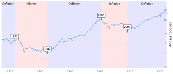 Since Real GDP has been relatively constant over extended periods of time and all other factors are driven by inflation, a primary driver of the stock market is inflation — as it trends toward or away from price stability. Given the current state of low inflation and the likelihood of it either rising (inflation) or declining (deflation), P/E ratios are expected to decline, in general, for a number of years. As P/E ratios decline and EPS grows, the result will be another relatively nondirectional secular bear market. (Financial Physics, 2022 update)