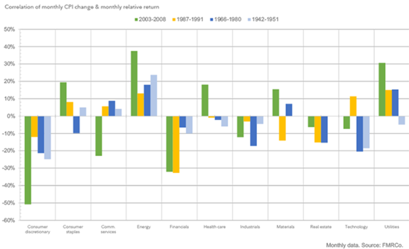 The fantastic chart from Fidelity below shows how well sectors have performed in four different inflationary regimes. Energy and utilities are the most consistent winners followed by consumer staples. Health care and materials are inconsistent winners. The most consistent losers are consumer discretionary, financials, industrials, real estate, and technology.
