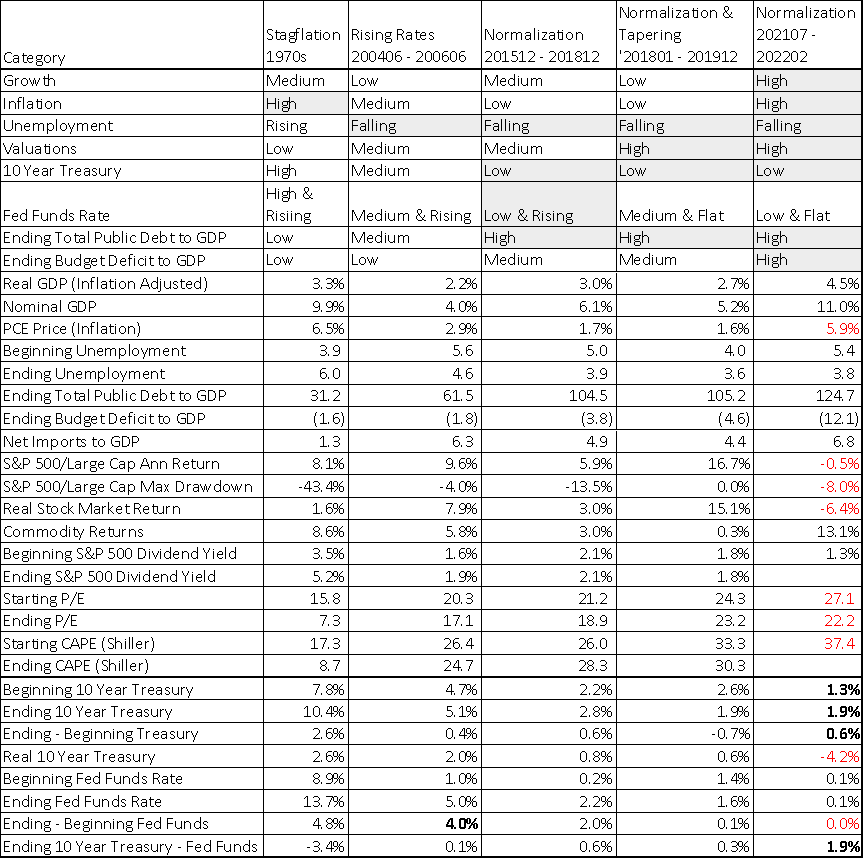 Table #1 shows the similarities and dissimilarities between the current environment and five other periods. The grey areas show similarities to the current economy and market. The red font indicates areas of concern. Yes, this time is different! There are several points to highlight: