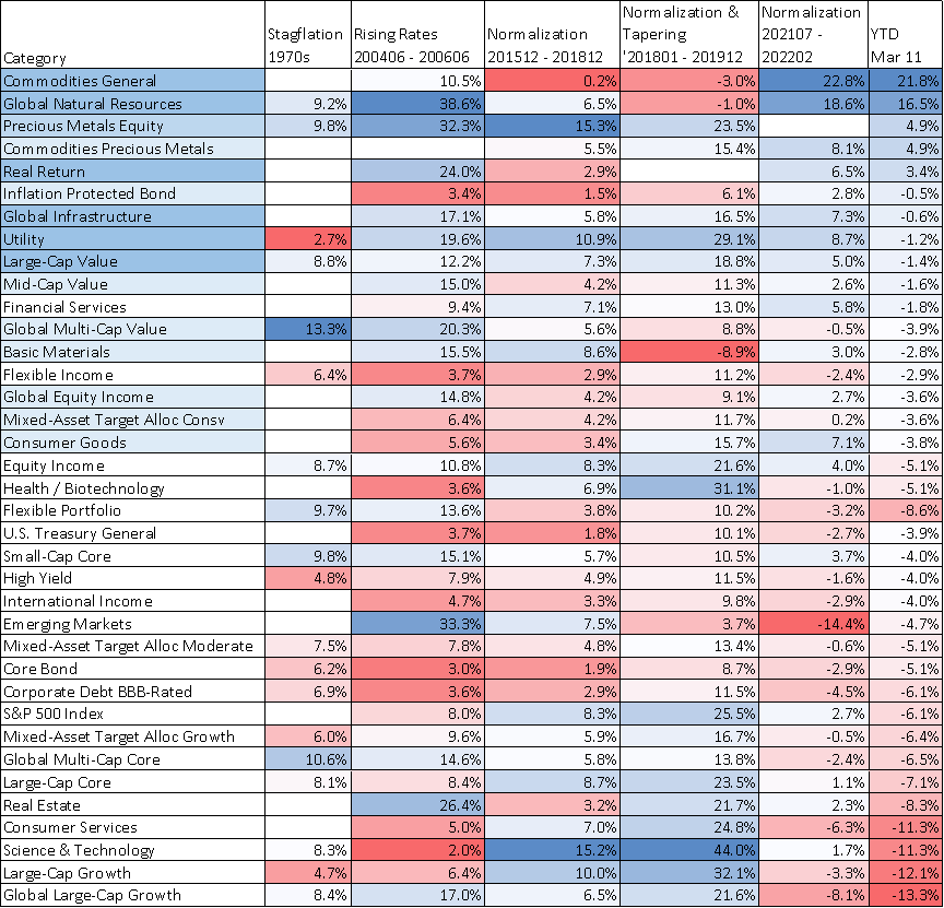Key Point: During similar time periods of inflation, rising rates, and/or quantitative tightening, commodities, global natural resources, precious metals, real return, inflation-protected bonds, global infrastructure, utilities, consumer staples, and value have performed relatively well.