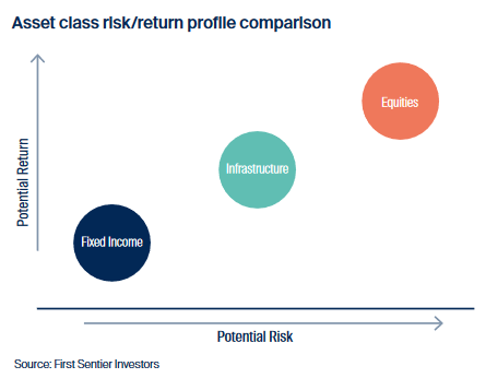 The combination of downside protection (both from income and from the fact that they’re necessary investments to maintain essential services) and upside potential (because demand is soaring and there’s a big backlog of projects already) arguably place the infrastructure asset class in the midpoint between other classes: higher returns than bonds, lower volatility than stocks, potentially with a higher Sharpe ratio than either.