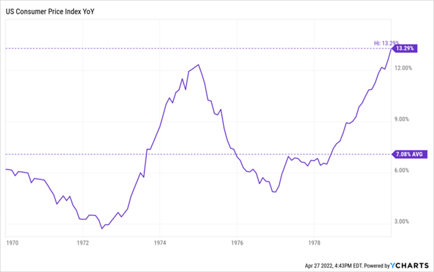 Now, let’s look at inflation in the 1970s. The average year-on-year CPI was 7%.