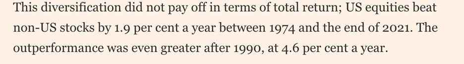 We know good companies that live abroad. We know investing in them can be helpful and perhaps add a buffer to our US stocks portfolio. That’s the theory. But has it worked? Not really according to the data.
