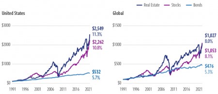 Over these 30 years, domestic real estate modestly outperformed stocks, while globally real estate ever so slightly underperformed stocks. Had the time frame selected been 15 years (2006 – 2021) instead, real estate would have fared worse than stocks. One can see a large real estate peak in 2006, after which it fell much more sharply than stocks. It is not unreasonable to say that real estate and stocks have performed similarly, though by following different paths, over the long term.