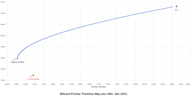 Despite the volatility of real estate being higher than that of stocks, adding real estate to a pure stock portfolio can reduce its volatility while increasing expected returns. This magic happens because the correlation between the two asset classes over the same time period was just 60%. Portfolio Visualizer shows the potential efficient frontier map, and reports that a roughly 75/25 stock to REIT mix would give the highest Sharpe ratio.