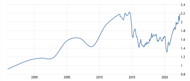 Price conversions are a bit tricky since petrol is priced in pounds or Euros per litre but the broad pattern is this: petrol topped a $4 / gallon mark in the last 1990s when Bill Clinton was in office and has never dropped below it. Here’s the British price in pence per litre. Any price about 105 pc is above $4 / gallon.