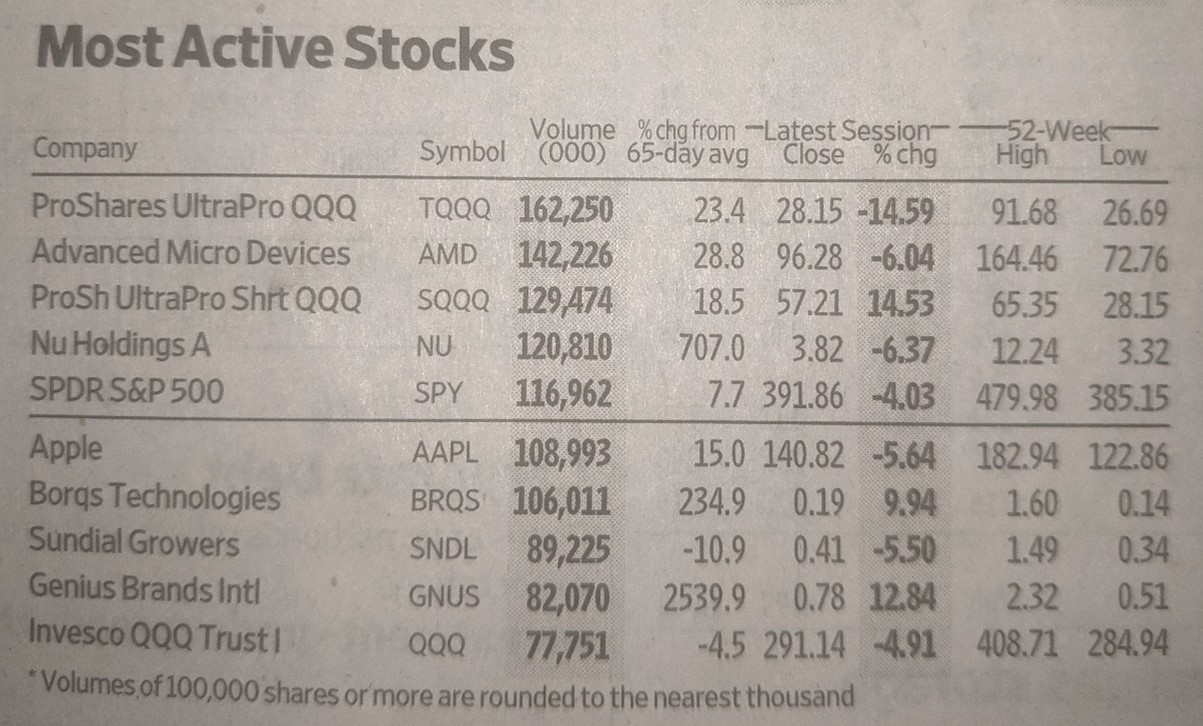 The “most active stock” is actually a leveraged bet in favor of the NASDAQ. The third most active stock is an equally leveraged bet against the NASDAQ, the fifth and 10th are straight bets on the S&P 500 and NASDAQ, respectively.
