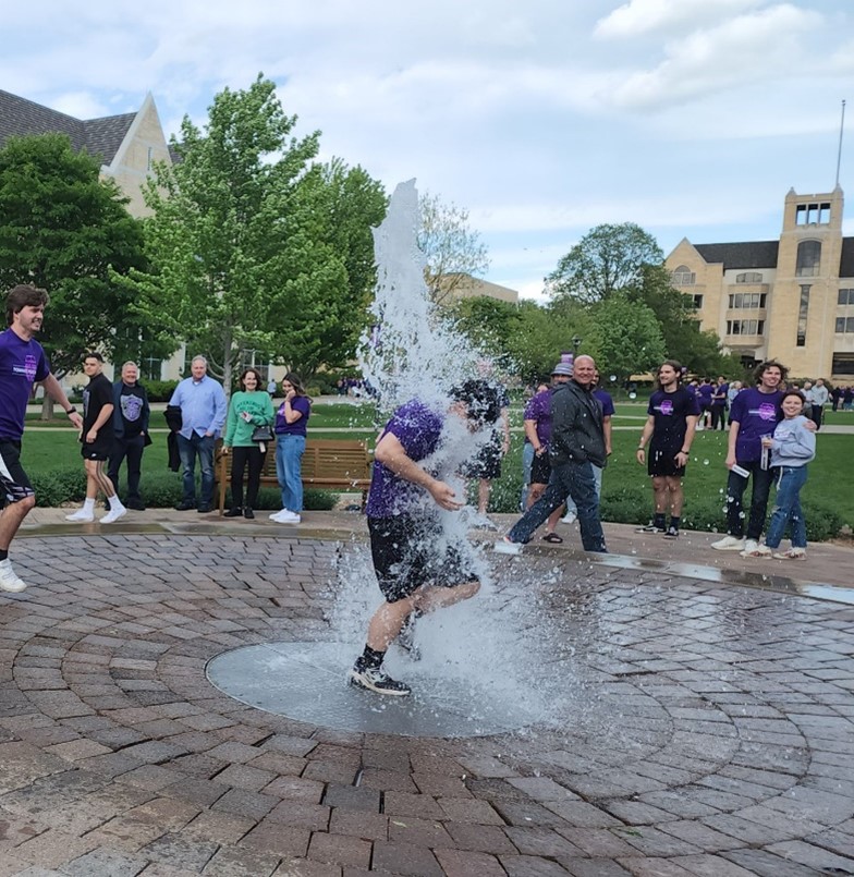My son celebrated, perhaps a bit more vigorously, the successful completion of his B.A. (and the impending beginning of his graduate work in counseling psychology) by charging through a 10’ geyser of water on a 50-degree day.