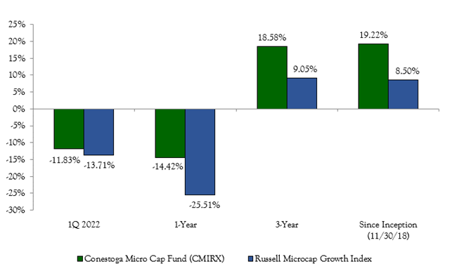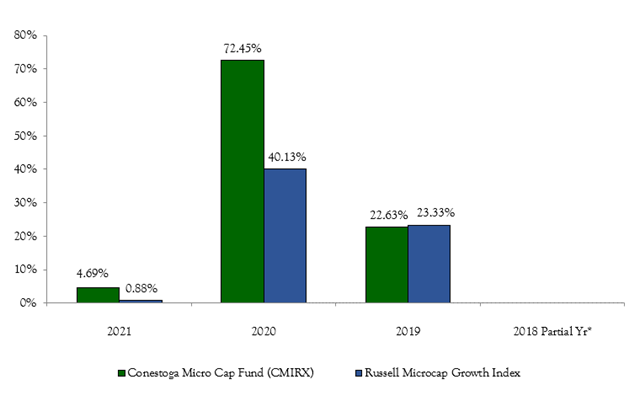 The Fund was launched on December 17, 2021. The strategy began life as a limited partnership, also called the Conestoga Micro Cap Fund, LP, on November 30, 2018 which means it’s coming up on its five-year anniversary.