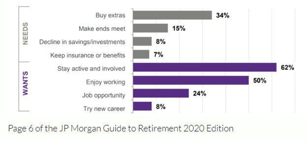 Abraham Maslow introduced the “Hierarchy of Needs” in 1943 in “A Theory of Human Motivation,” consisting of 1) Physiological (food, water, shelter, etc.), 2) Security and Safety, 3) Social (family, friends, community), 4) Esteem (appreciation, respect, value), and 5) Self-Actualization (personal growth, potential). Figure #1 from Ashy Daniels for the Retirement Field Guide, in “10 Charts About Retirement Every Retiree Should See (2020),” explains why Americans are working longer by dividing the reasons into the “Needs” and “Wants.”