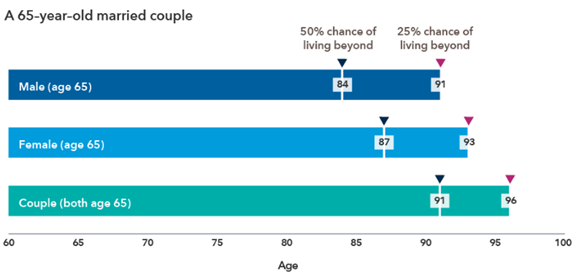 Source: Capital Group and Society of Actuaries and American Academy of Actuaries, Actuaries, Actuaries Longevity Illustrator, as of May 10th, 2021